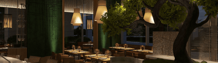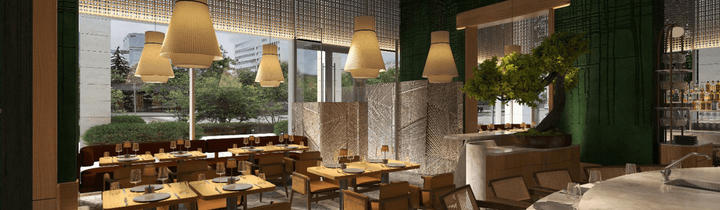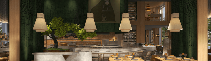 Погружение в азиатскую эстетику продолжается и в интерьере: зеленые оттенки, фактурные покрытия, лианы на потолке, канаты в тайско-балийском стиле. Мебель из натуральных материалов — дерева, кожи, камня — подчеркнет связь с природой. В центре зала — открытая кухня и бар, перетекающий в будущий chef’s table. Также предусмотрен отдельный кабинет на 6 мест на втором этаже.