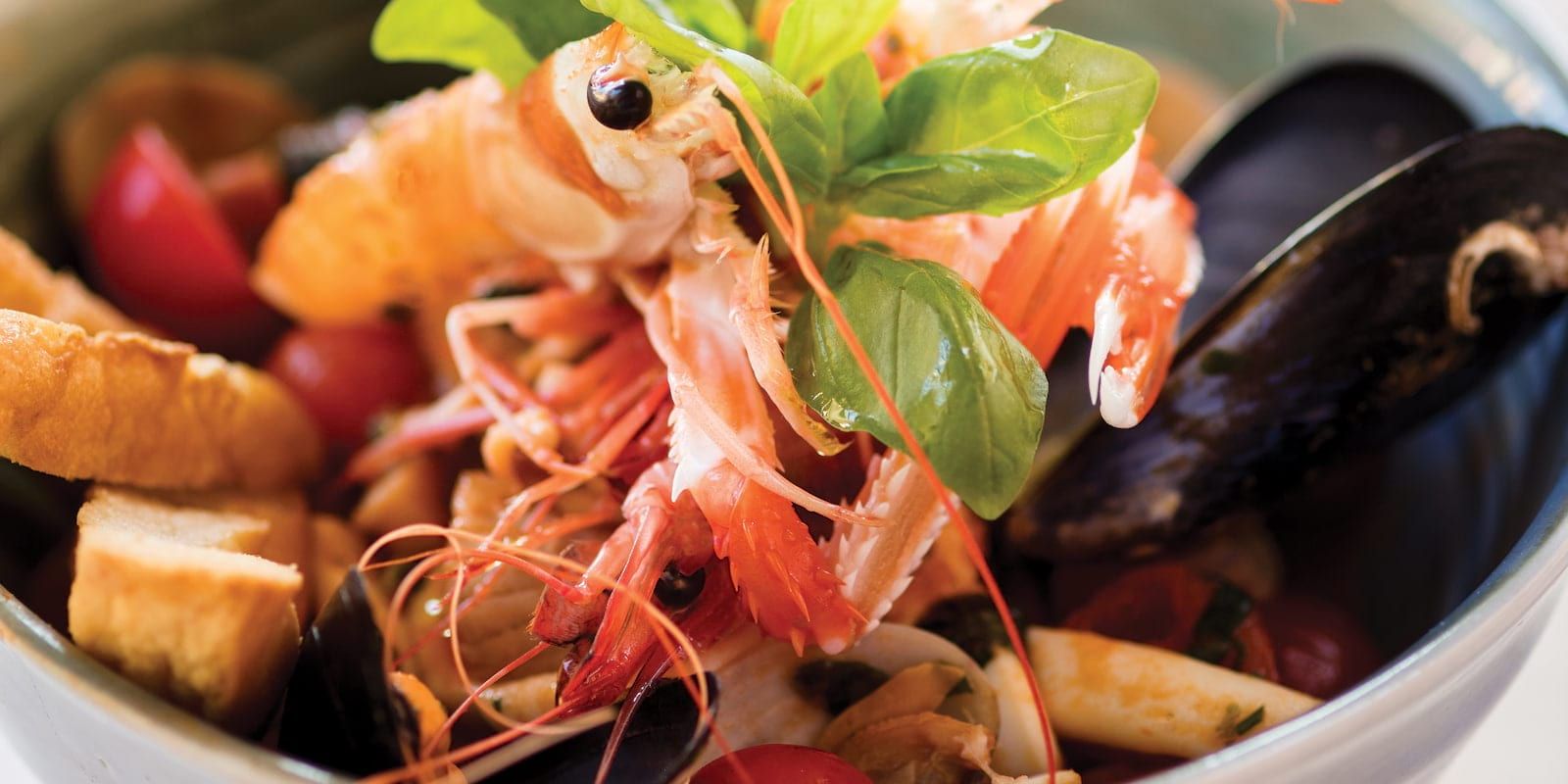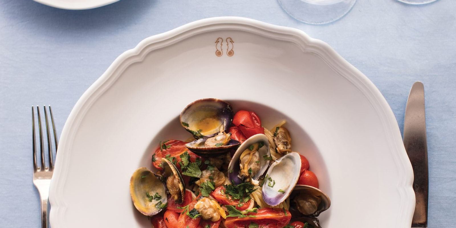 Идеальные декорации для явления изысканных блюд шеф-повара Коррадо Корти, иллюстрирующих его представления о современной лигурийской кухне. Лобстера он подает с оливками, каперсами и сыром страччино, телятину — со стейком из тунца и перепелиными яйцами, а равиоли фарширует бураттой, анчоусами и сопровождает пюре из мяты и зеленого горошка.
