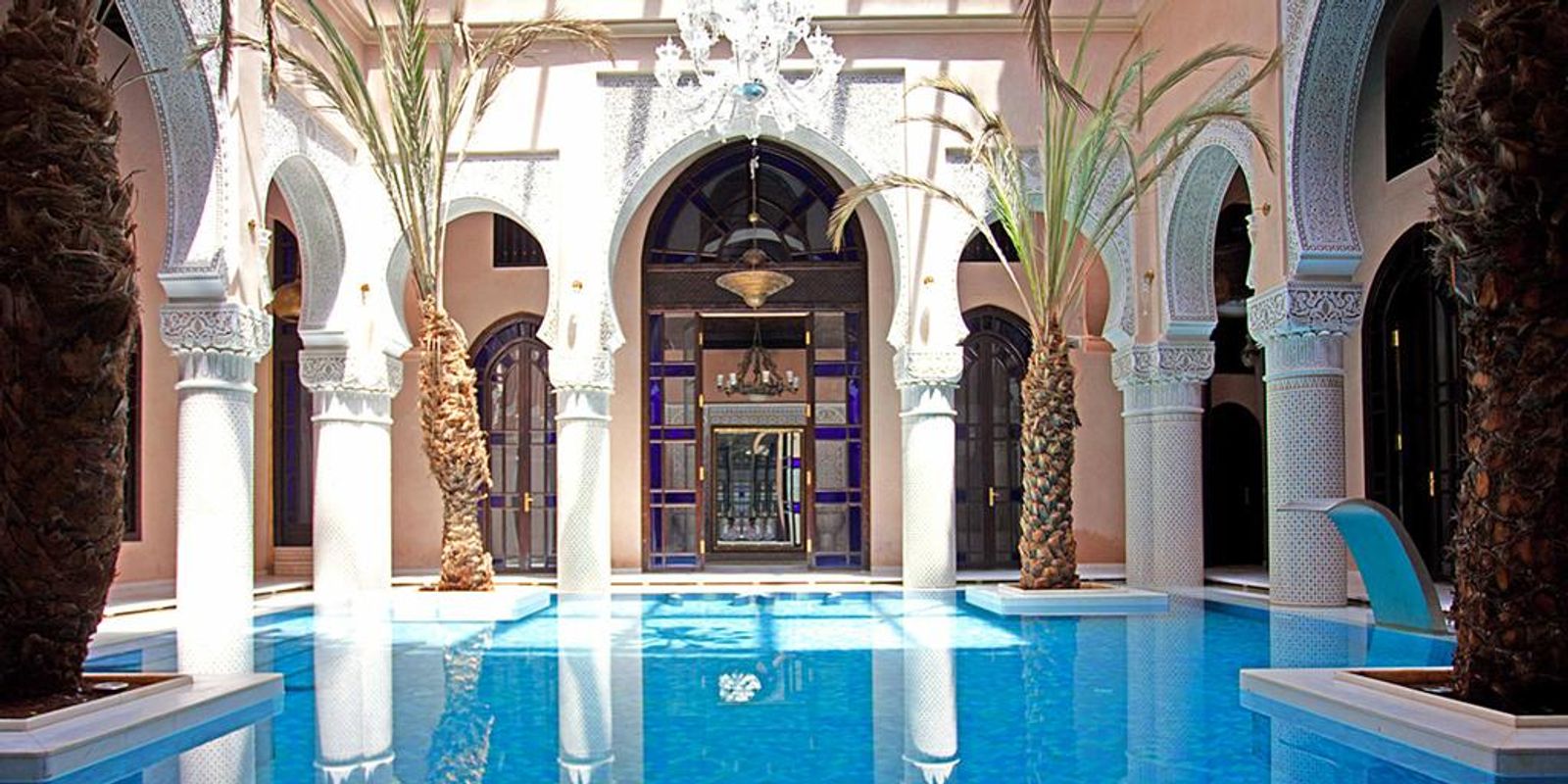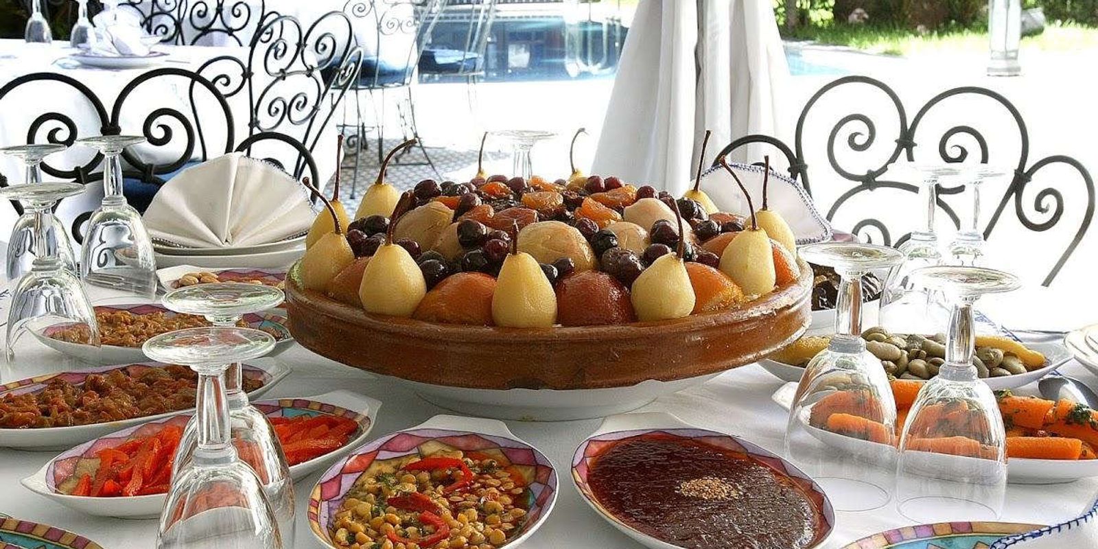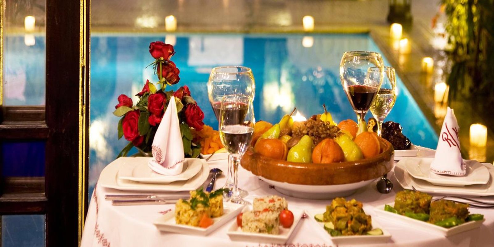 Колонны, украшенные керамической плиткой в технике зелидж, мраморный фонтан, начищенные медные люстры, драгоценная антикварная мебель и атмосфера восточной неги подчеркивают роскошь изобретательной кухни, традиционной для Феса.