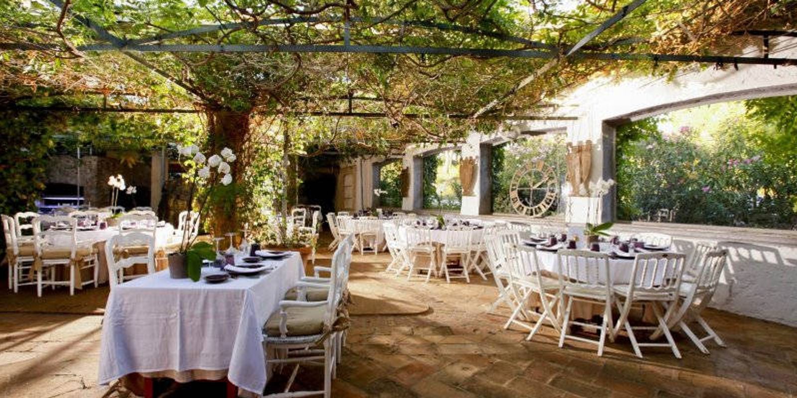 В ресторане есть два совершенно разных пространства: зал с камином, где можно насладиться романтическим ужином, и просторная открытая терраса с небольшим фонтаном и зеленой перголой, откуда открываются живописные виды на окрестности.