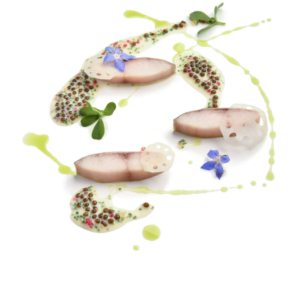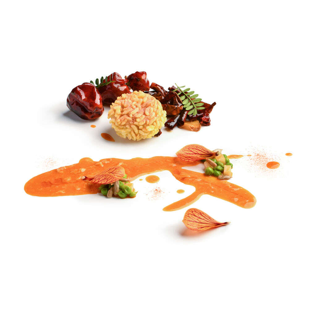 Декоративная ДНК, ставшая символом ресторана, распространяется и на оформление блюд заведения. Вкус блюд вполне соответствует креативному великолепию подачи. Французские рецепты причудливо сочетаются с китайскими вкусами: лучший пример такого креатива — свиная грудинка в су-виде с квашеной капустой в стиле дунбэй, салат из сырой рыбы в кантонском стиле, где ломтики окуня покрыты сушёным дайконом, луком шалот, перцем чили, икрой и травами.