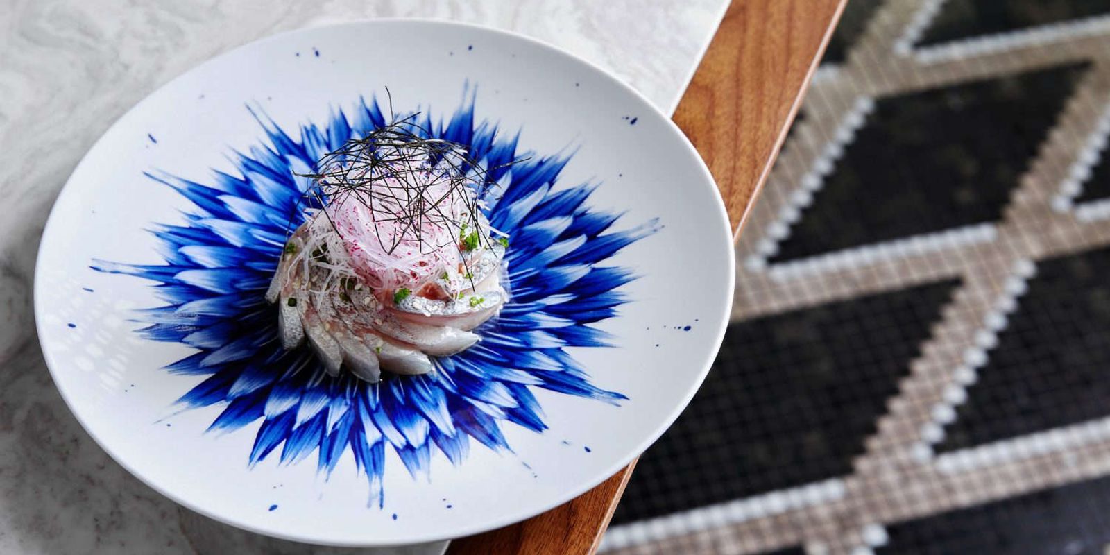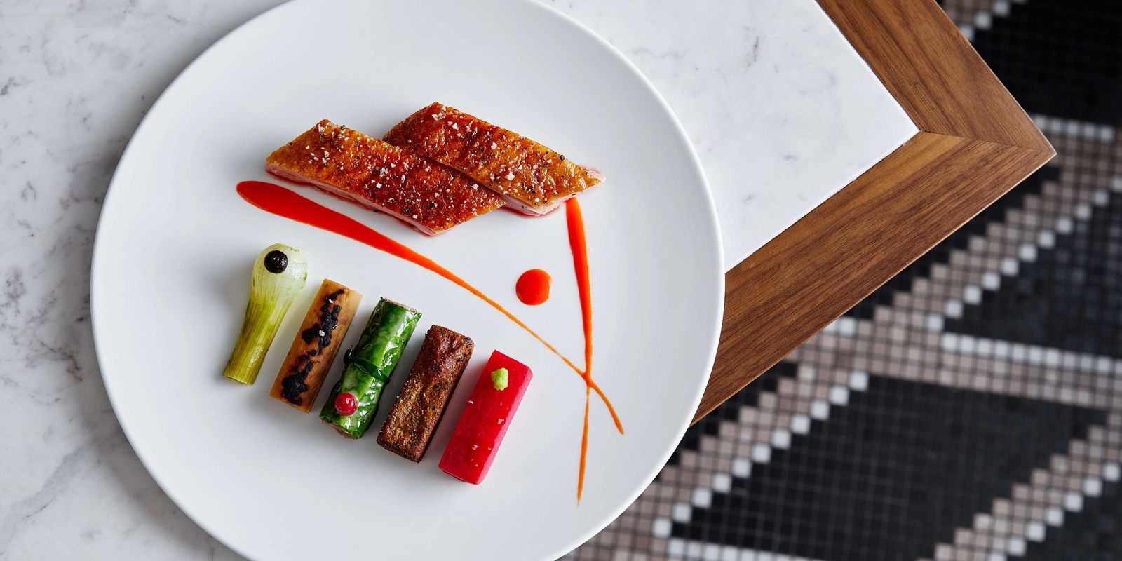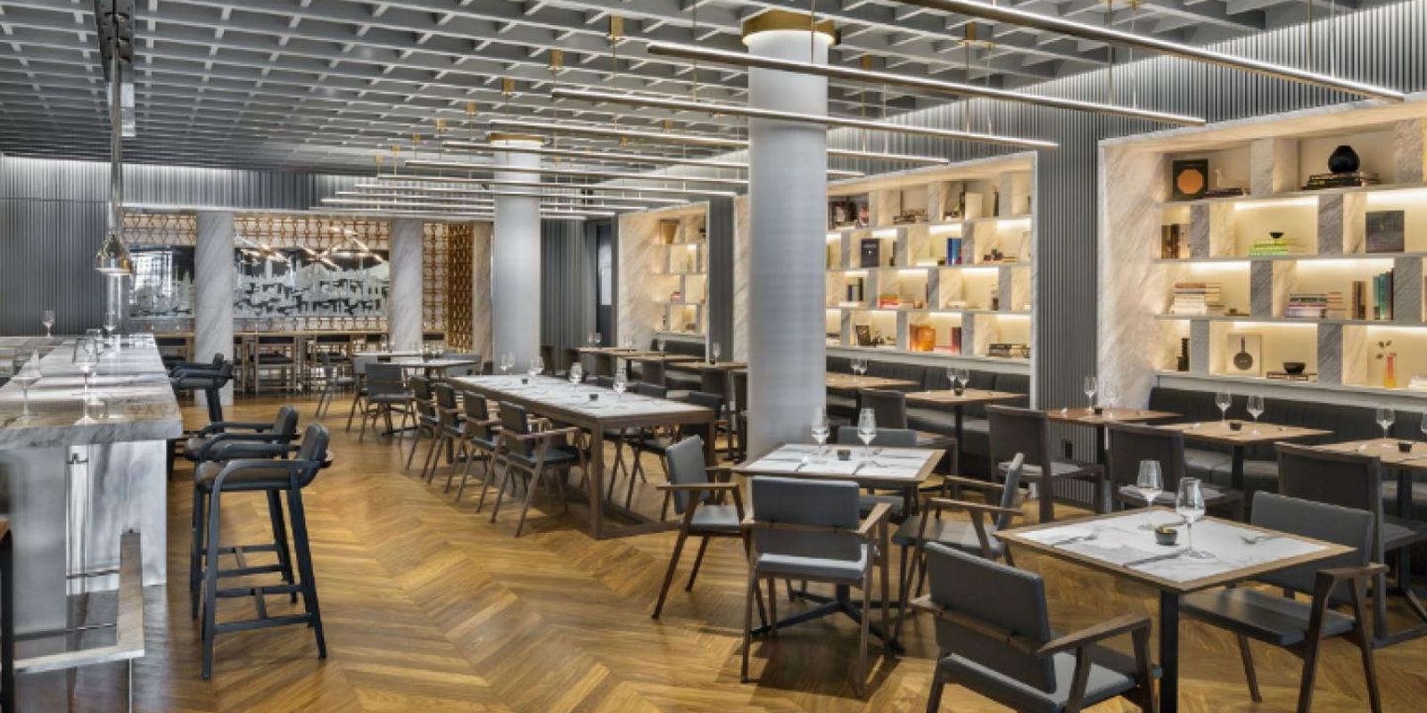 Посетители могут поужинать на открытой террасе, которая представляет собой гибкую модульную зону отдыха на тротуаре с обтекаемым обеденным павильоном в форме буквы L и семью столами.