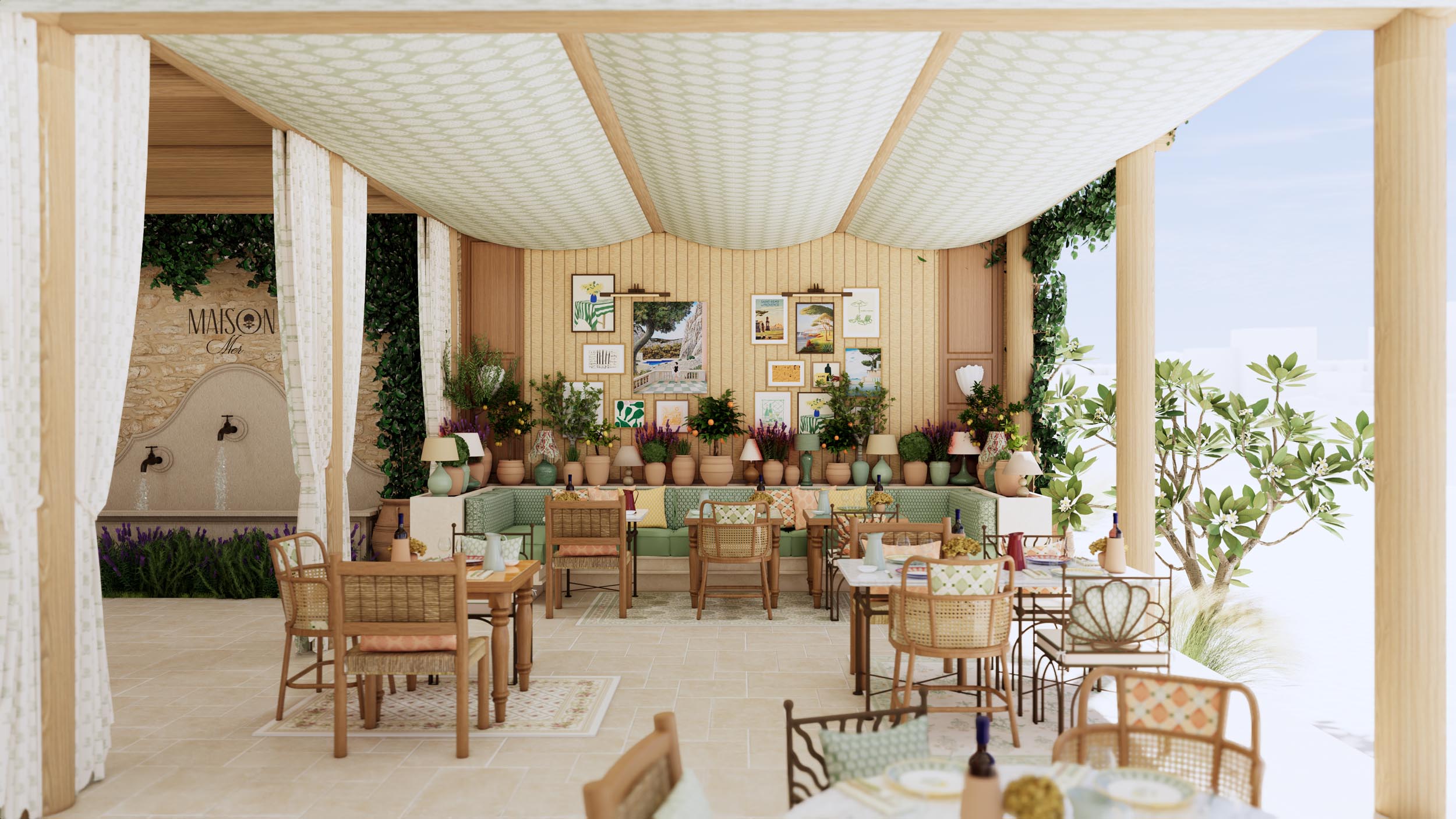 Гости заходят через известняковую арку и следуют по садовой дорожке, обрамленной тропическими растениями. Столы выложены мозаичной плиткой оттенков тимьяна и базилика. Антикварные предметы из бутиков Прованса добавляют обаяния, и даже террасы под полосатыми зонтиками как будто отрезаны от суеты ближневосточного мегаполиса.