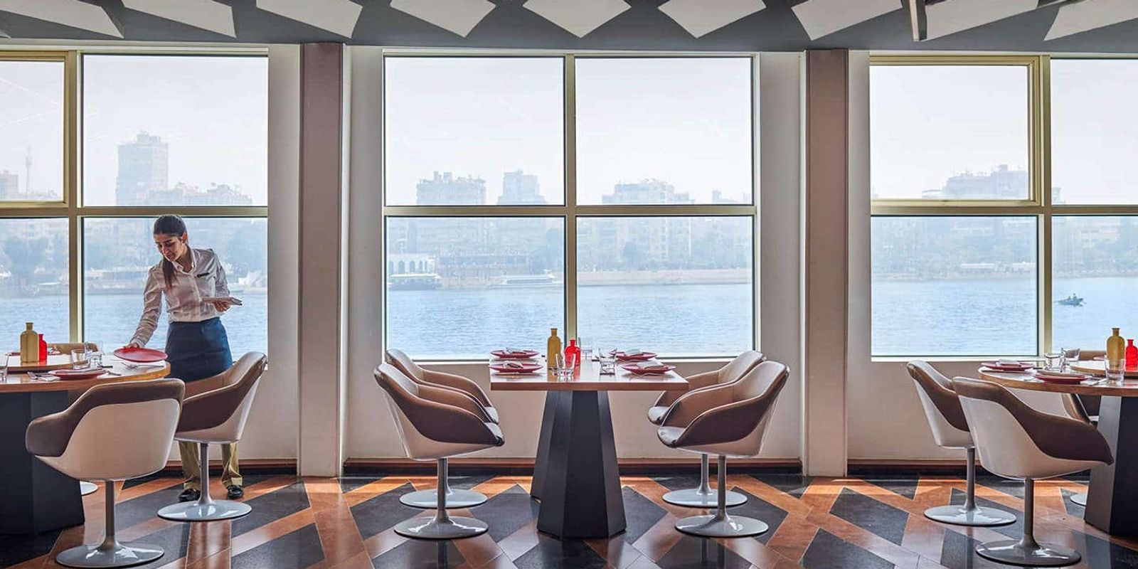 Один из самых модных баров города Nairu Restaurant&Lounge, расположенном на борту судна First Nile Boat от пятизвездочного отеля Four Seasons at the First Residence с потрясающим панорамным видом на Каир, Нил и пирамиды.