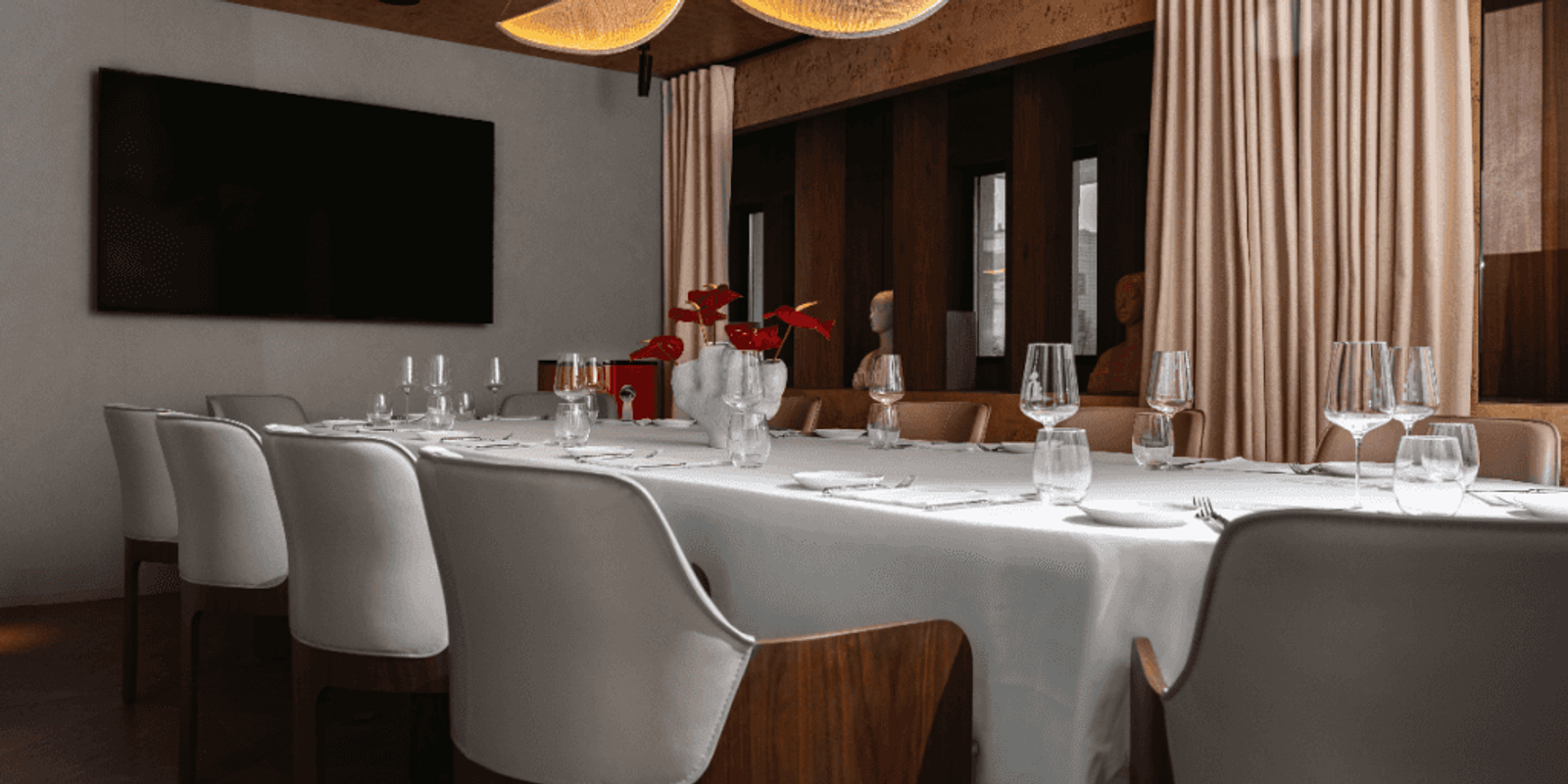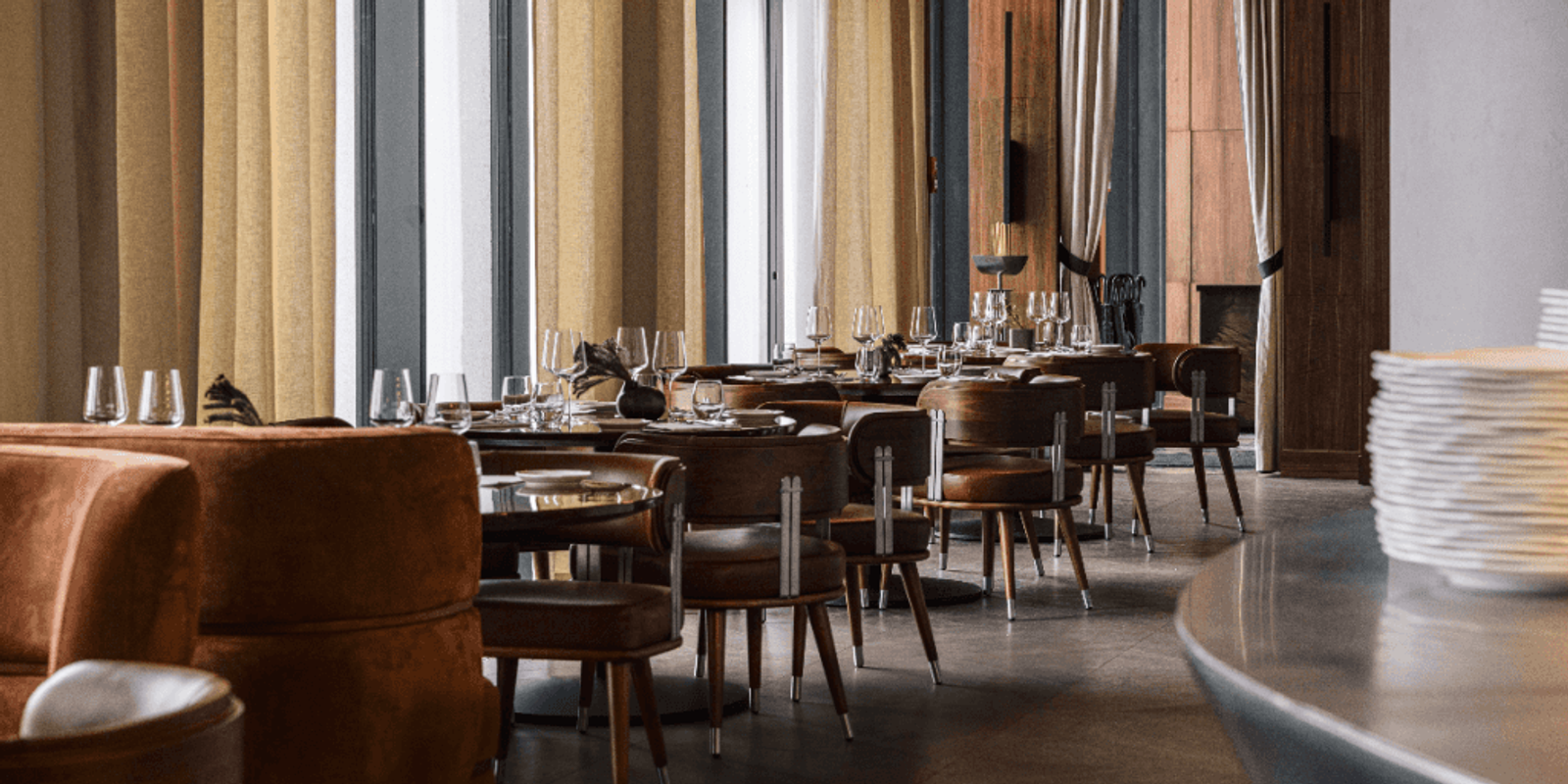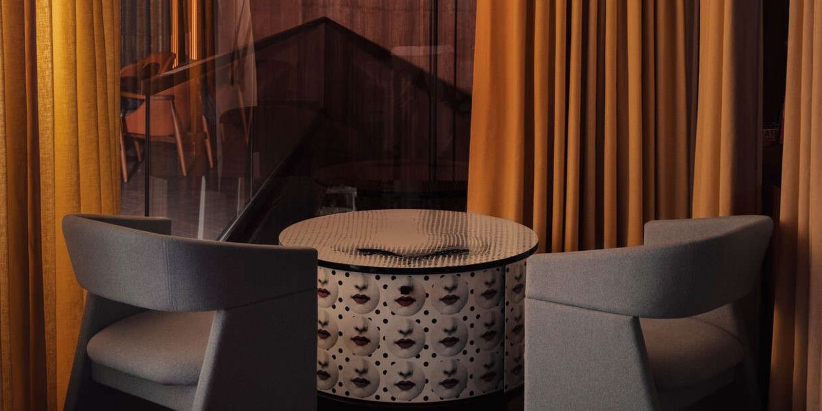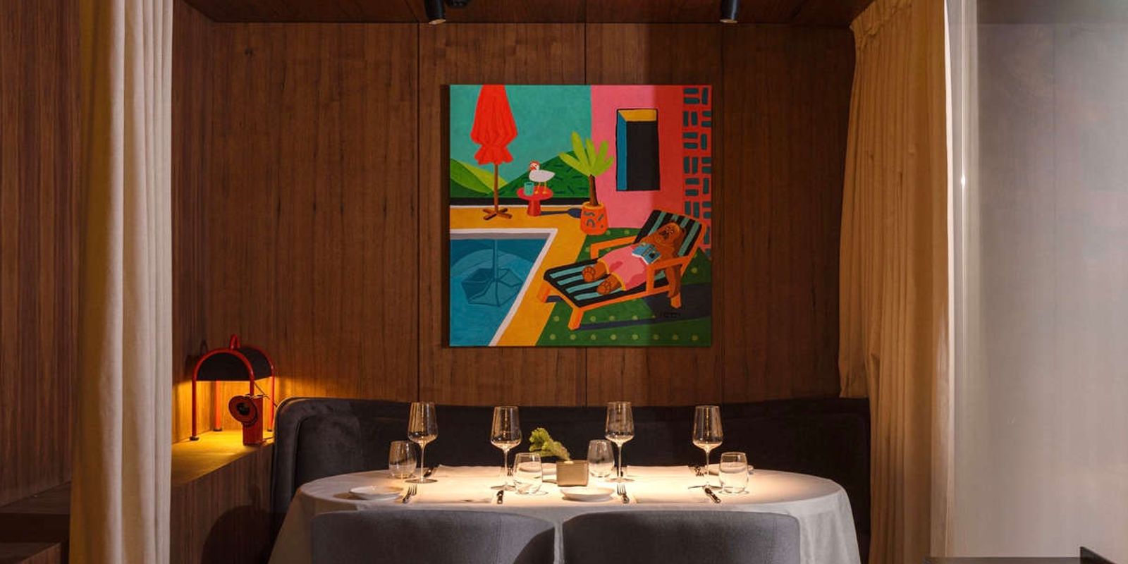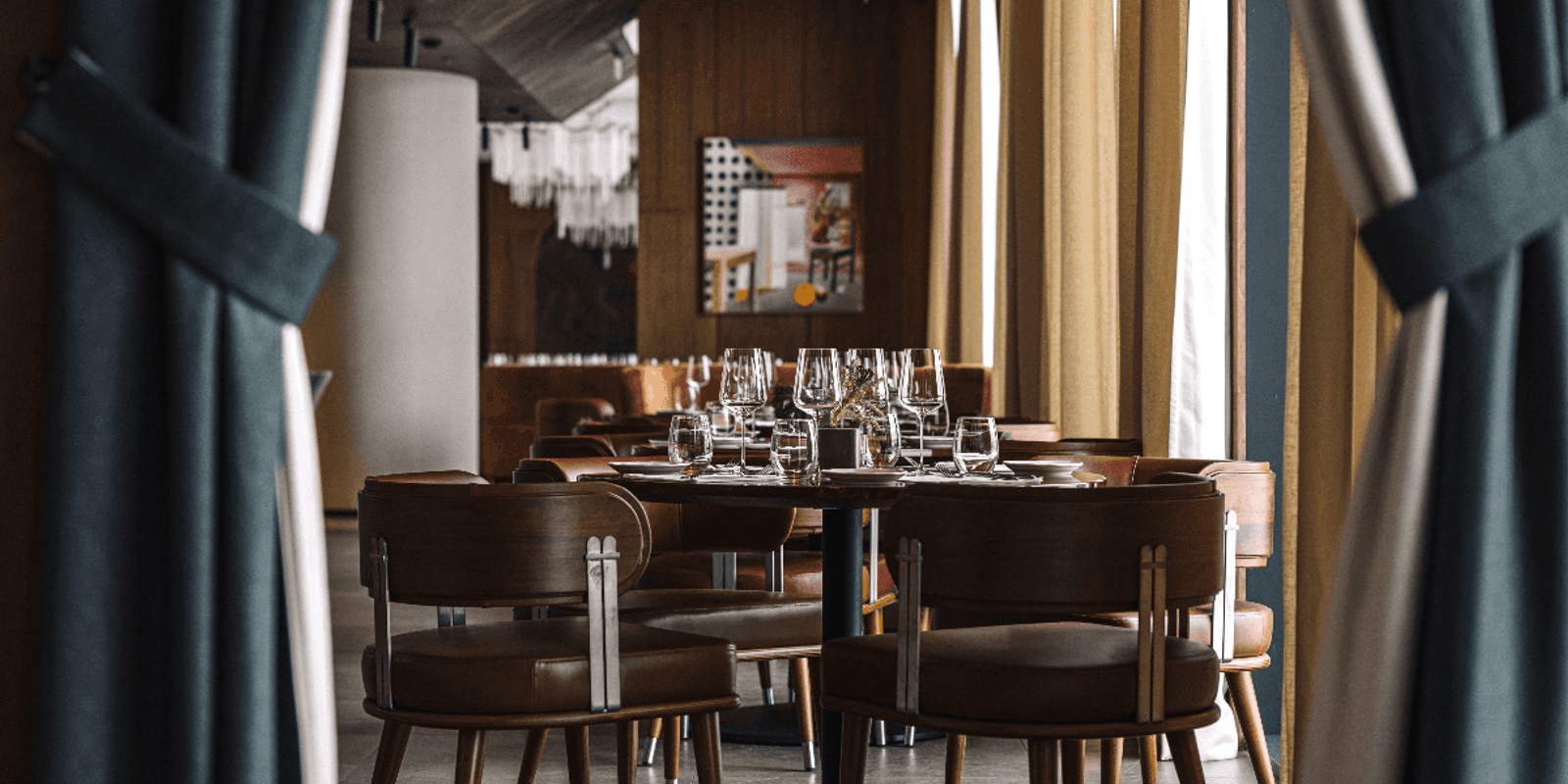 Интерьер представлен в мягких темных оттенках. Акцент сделан на плавных линиях и тактильных фактурах: оловянная стойка на кухне, темное дерево в винной комнате. На втором этаже камерное пространство с яркими деталями из Европы и отдельными залами. Среди картин работы российских художников галереи современного искусства сцена/szena Кирилла Гаршина, Ахмата Биканова и Николая Бахарева.