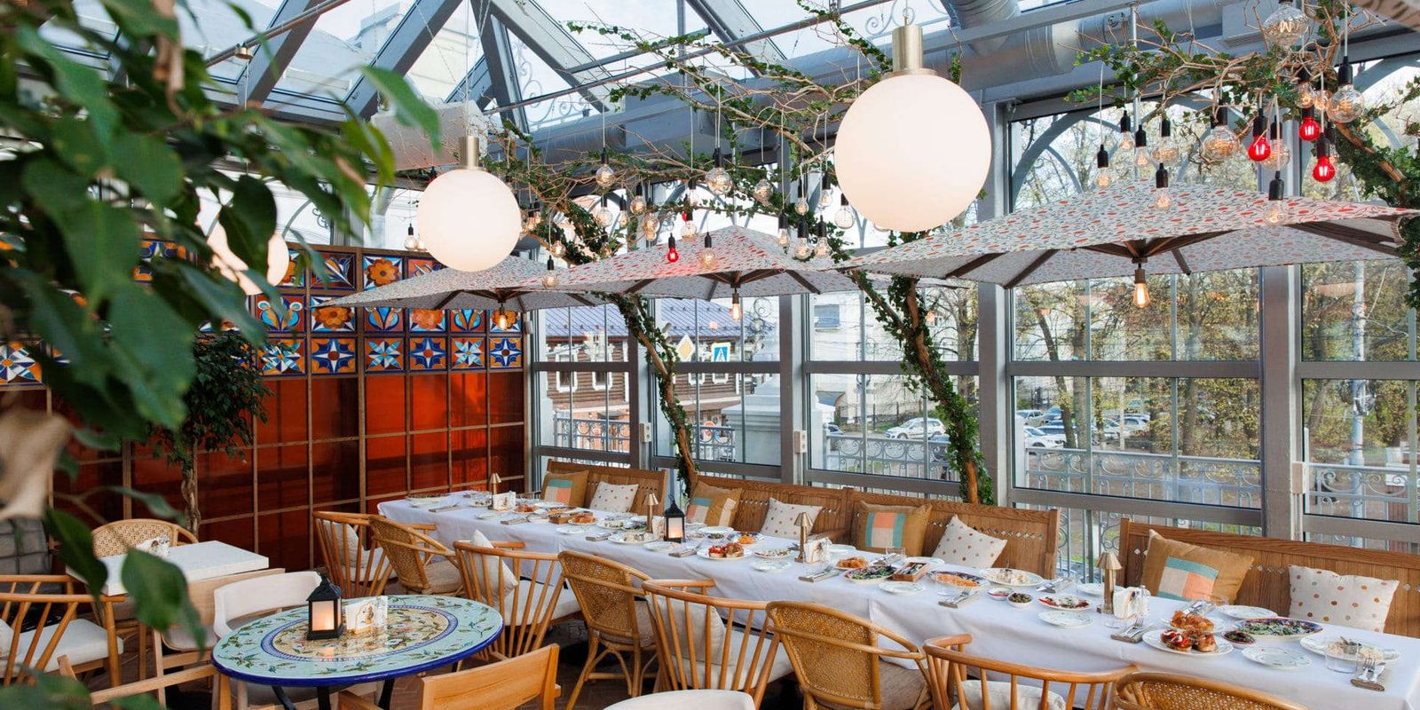 Конструкция здания позволила создать в Osteria Lucia просторный зал-оранжерею, за которой уже закрепился статус одного из лучших видов на Ярославль. Оттуда открывается отличный вид на улицу Свободы, парк, храмы. Сам тип зала-оранжереи - постройка в стиле начала XX века – время строительства этого здания. Для создателей проекта было очень важно стилистически подчеркнуть красоту здания. Внутри также постарались сделать красиво – одна из стен декорирована витражами с итальянскими орнаментами, над столами размещены зонты, которые кроме эстетической функции еще и защищают от солнца. А их паттерн пересекается с формой, разработанной для сотрудников проекта. В центре этого зала расположен контактный бар, а по краям – объемные решения в виде деревьев с большим количеством светящихся фонариков. Все это отражает главную метафору проекта – светящийся фонарь. Посмотрите в вечернее время на здание ресторана, и вы в этом убедитесь.
