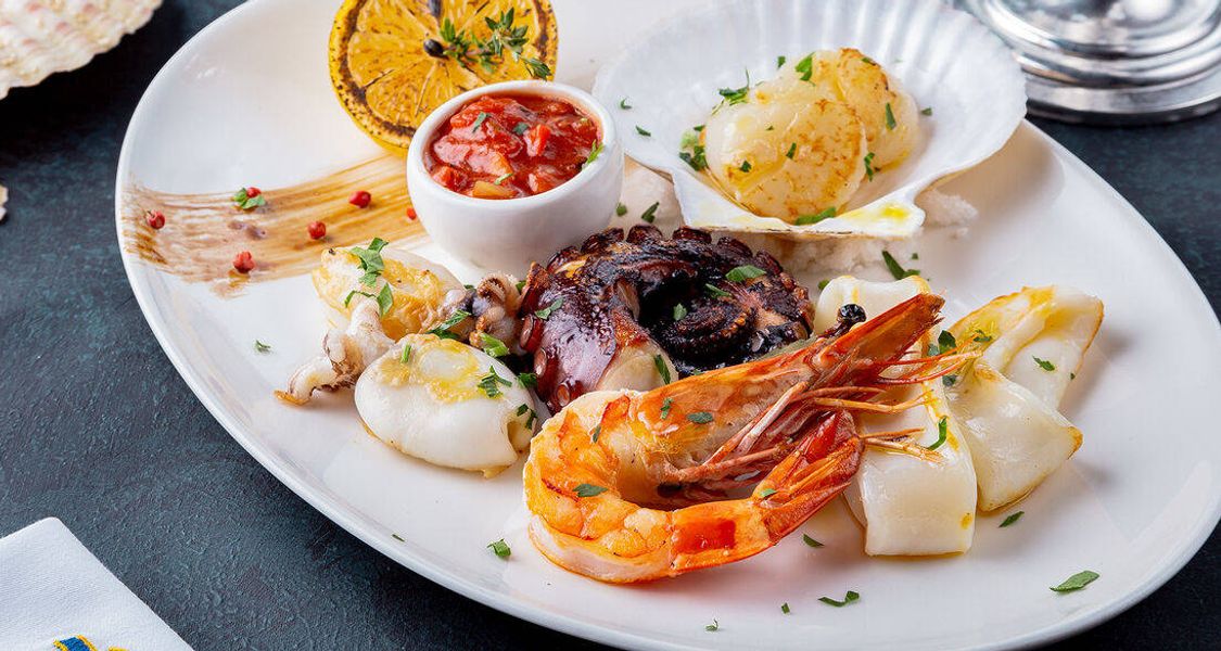 Особенность ресторана в Казани — огромная витрина с рыбой, кальмарами, креветками и другими морепродуктами на льду. Гости выбирают понравившиеся и решают вместе с поваром, как они будут приготовлены. Есть семь вариантов, в том числе, на гриле, в морской соли, на пергаменте с овощами, на пару, а также по вашему личному рецепту.