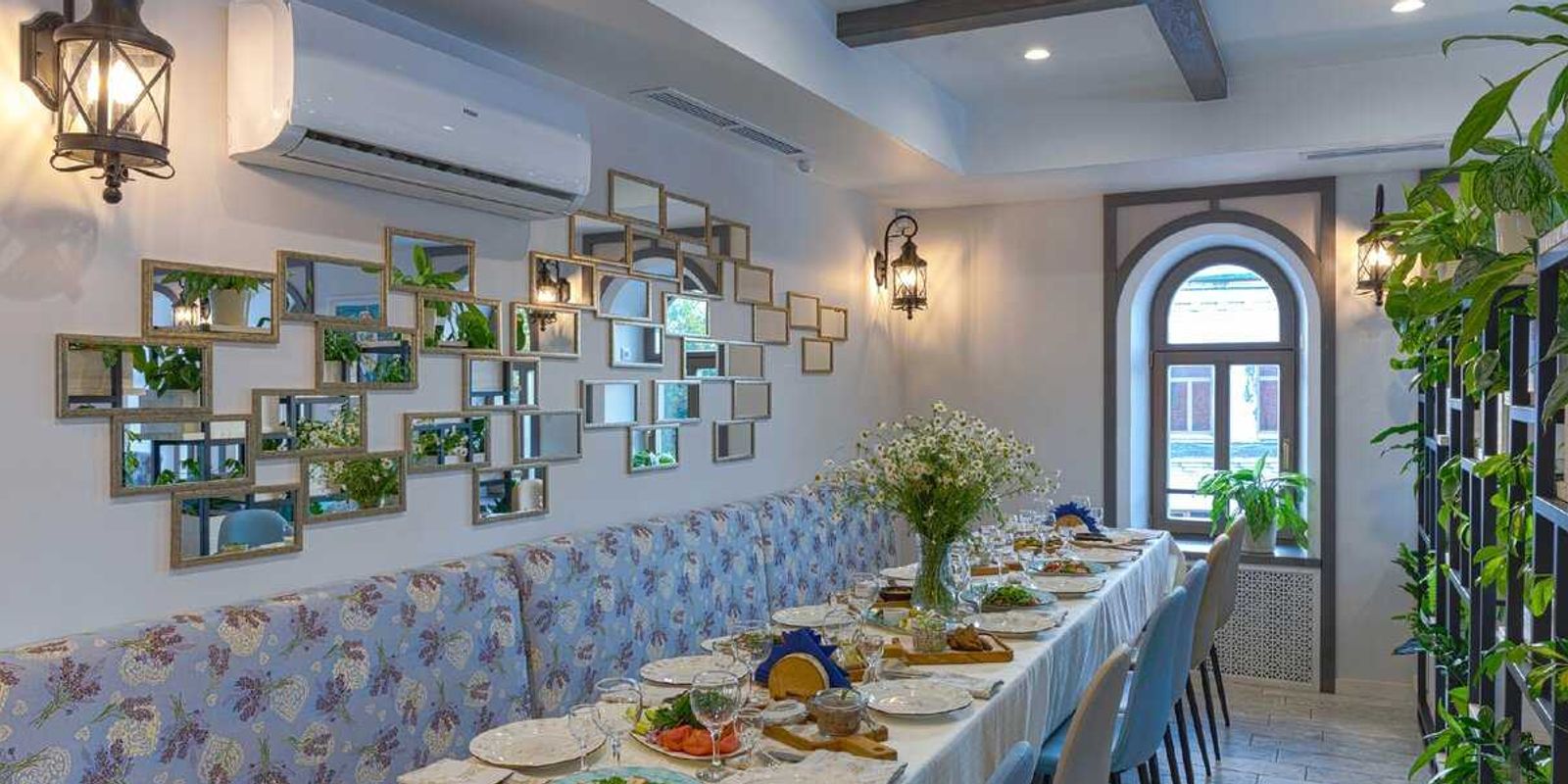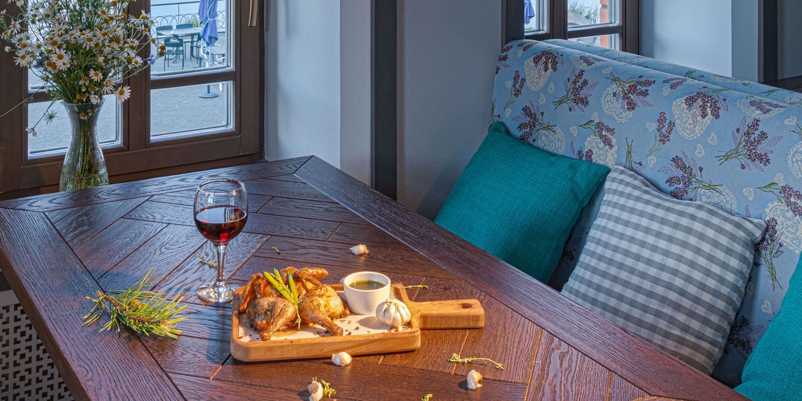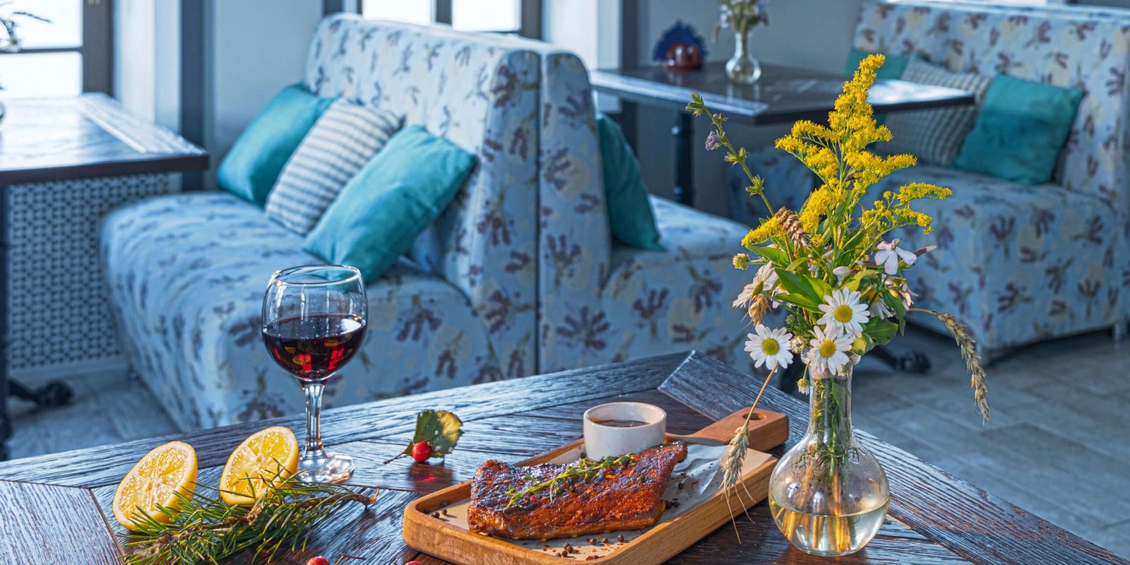 Эффектная барная стойка с деревянным декором, арка и уличные фонари обрамляют вид на кирпичную печь – сердце кухни ресторана. Именно здесь, на живых углях, готовят основные блюда из нового ресторанного меню. Зеркала, натуральное дерево, росписи на стенах – всё это создаёт ощущение комфорта и незабываемого уюта старинного города Плёса.