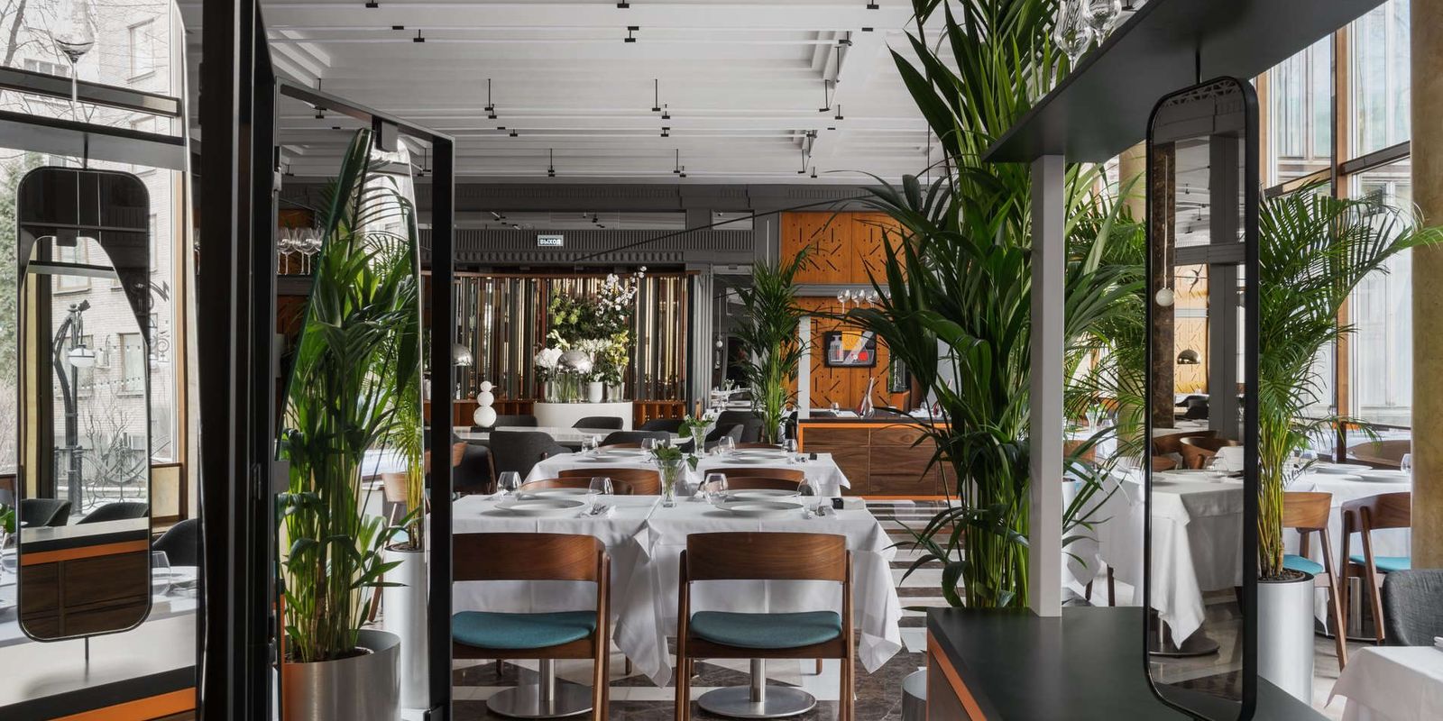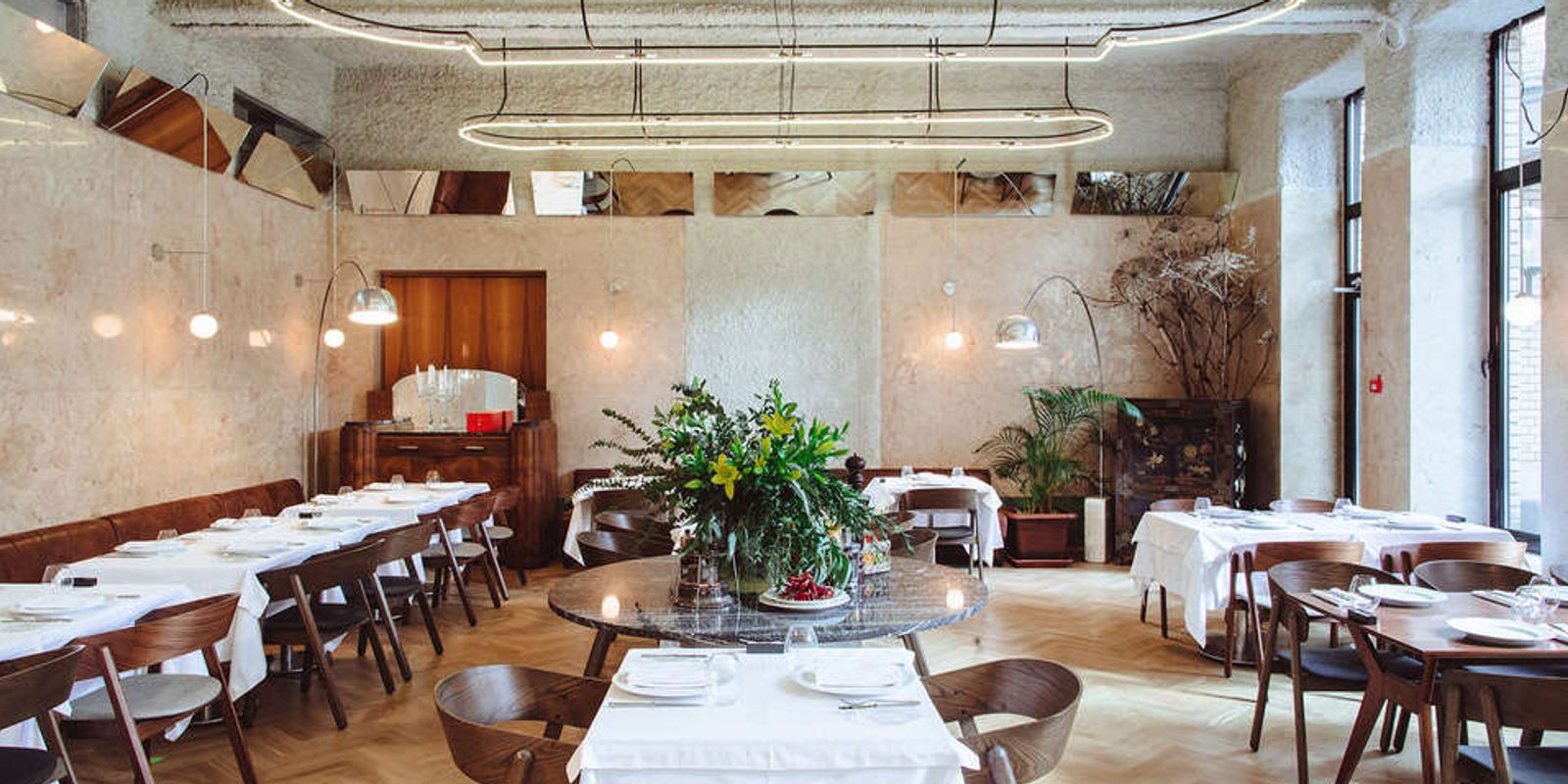 Внешне ресторан получился намеренно непримечательный, но интересный: в обстановке соединились черты интерьера московских советских помещений — паркет, желтое освещение, бетонные стены, простые белые скатерти, хрусталь.
