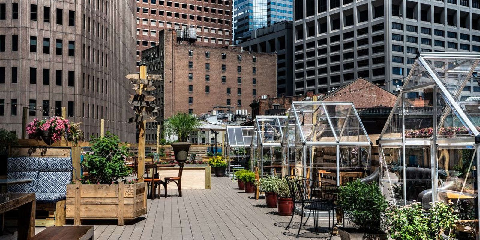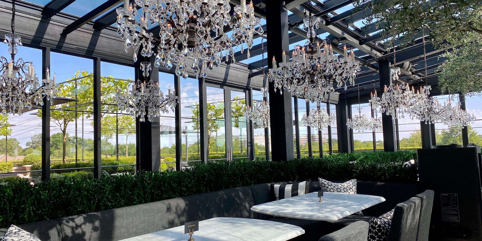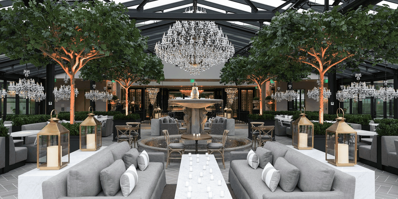 Пространство крытой террасы RH Rooftop наполнено светом, здесь можно разместиться на одном из стильных диванов. На террасе много живых деревьев в кадках.