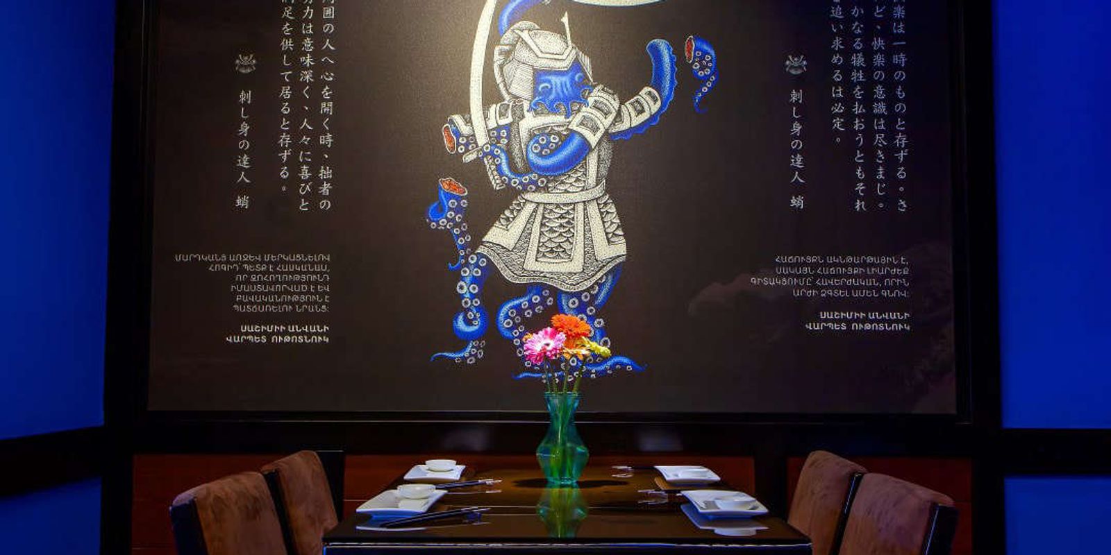 Samurai Sushi Bar – отличное место для любителей суши. Заведение славится своим оригинальным интерьером в японском стиле. На стенах здесь изображены самураи, а на потолке японская надпись, которая в переводе означает “Счастье, удача и самое совершенное состояние человека – спокойствие”.