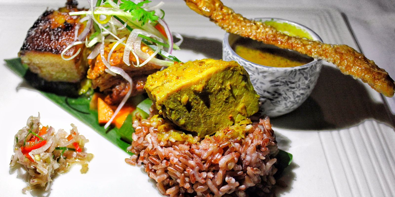 Трапеза здесь начинается с традиционного мытья рук водой с лаймом, панданом и лаймовыми листьями, затем следует каменная чаша, заполненная лалапаном — сырыми овощами с острым самбалом и местными крекерами, и просмотр меню.