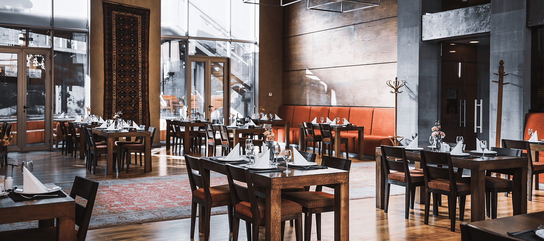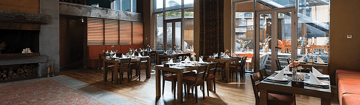 Просторное помещение дает много воздуха и света, а мебель и украшения в темных тонах сообщают ресторану некое настроение расслабленности. В праздничные дни здесь проходит особая программа. Рядом находится рынок «Вернисаж».