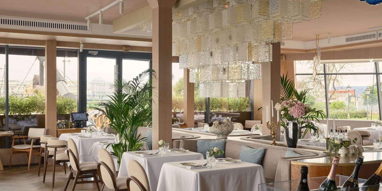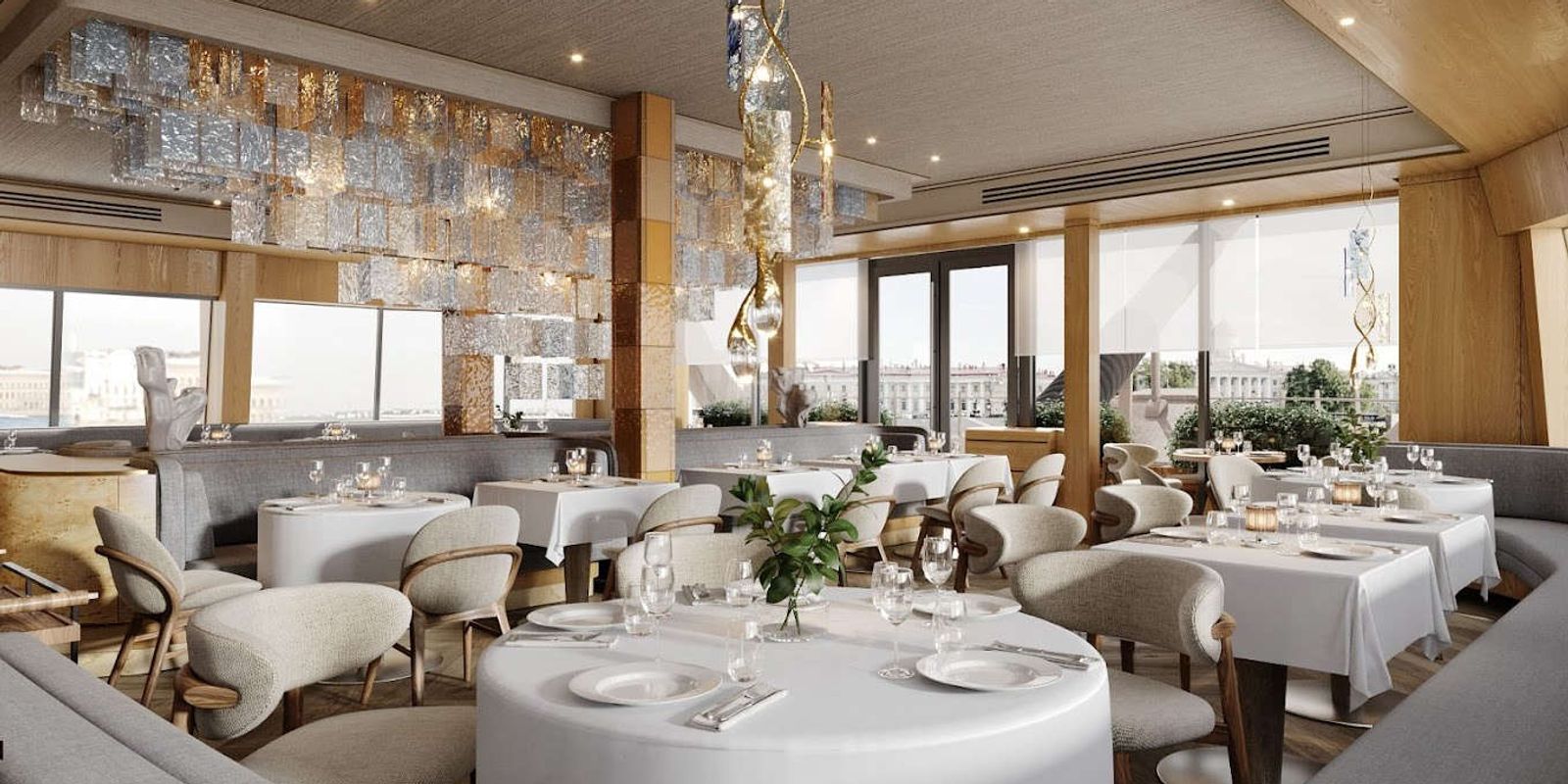 Панорамный вид на Неву, Эрмитаж, Стрелку Васильевского острова перекликается с внутренним изяществом ресторана Veter. В оформлении использован шпон дуба теплого оттенка и текстурная светлая мебель; на одной из стен размещено акцентное керамическое панно, а в центре зала и внимания — объемная стеклянная люстра, которая дарит солнечные блики днем и элегантность в вечернее время. Прямо на носу парусника расположена открытая терраса с лучшим видом на Петербург.
