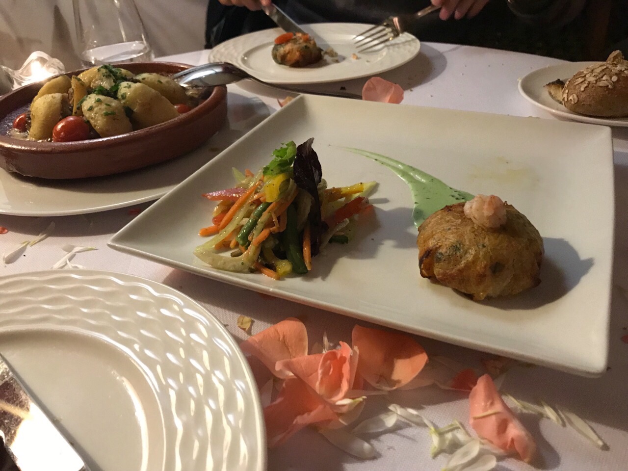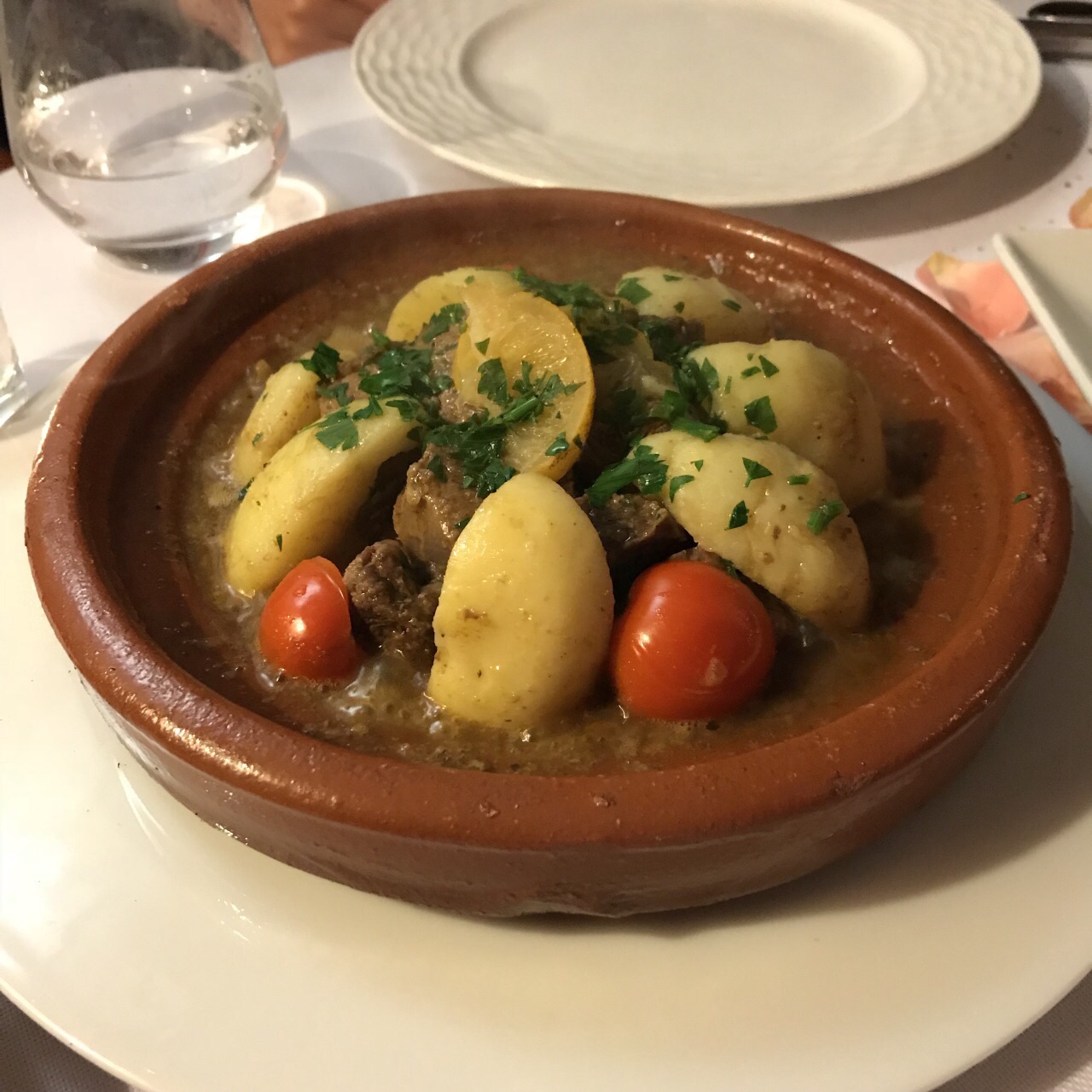 Меню заведения постоянно обновляется. Здесь представлена и европейская кухня, и марокканская, так что на одном столе могут встретиться мезе из восьми классических позиций и андалузский гаспачо с креветкой. Каре ягненка подают с яблоками и рататуем, утиную грудку под соусом бигарад — с полентой. Вегетарианцев порадует ризотто из чечевицы с грибами, цуккини и базиликом.