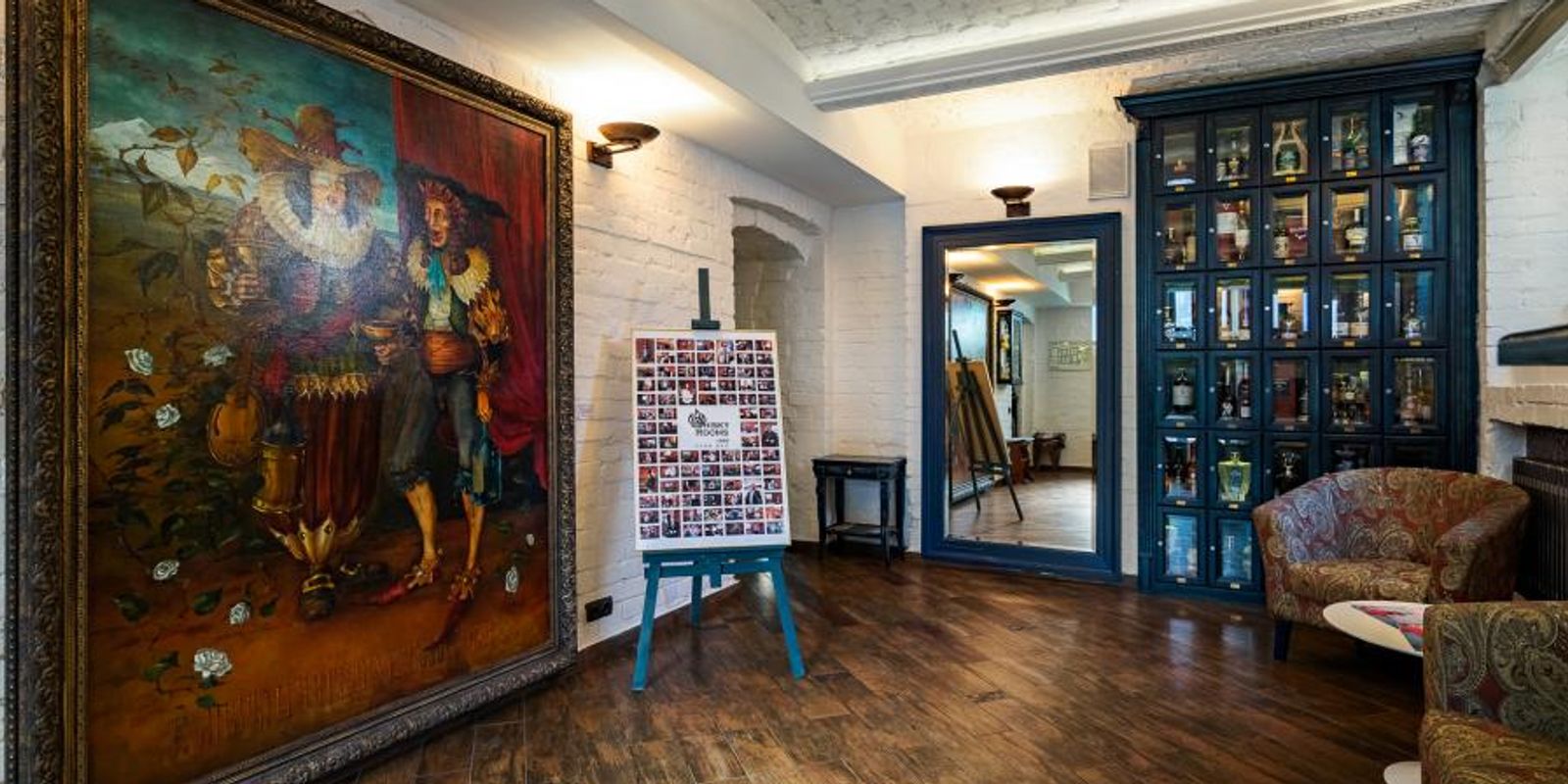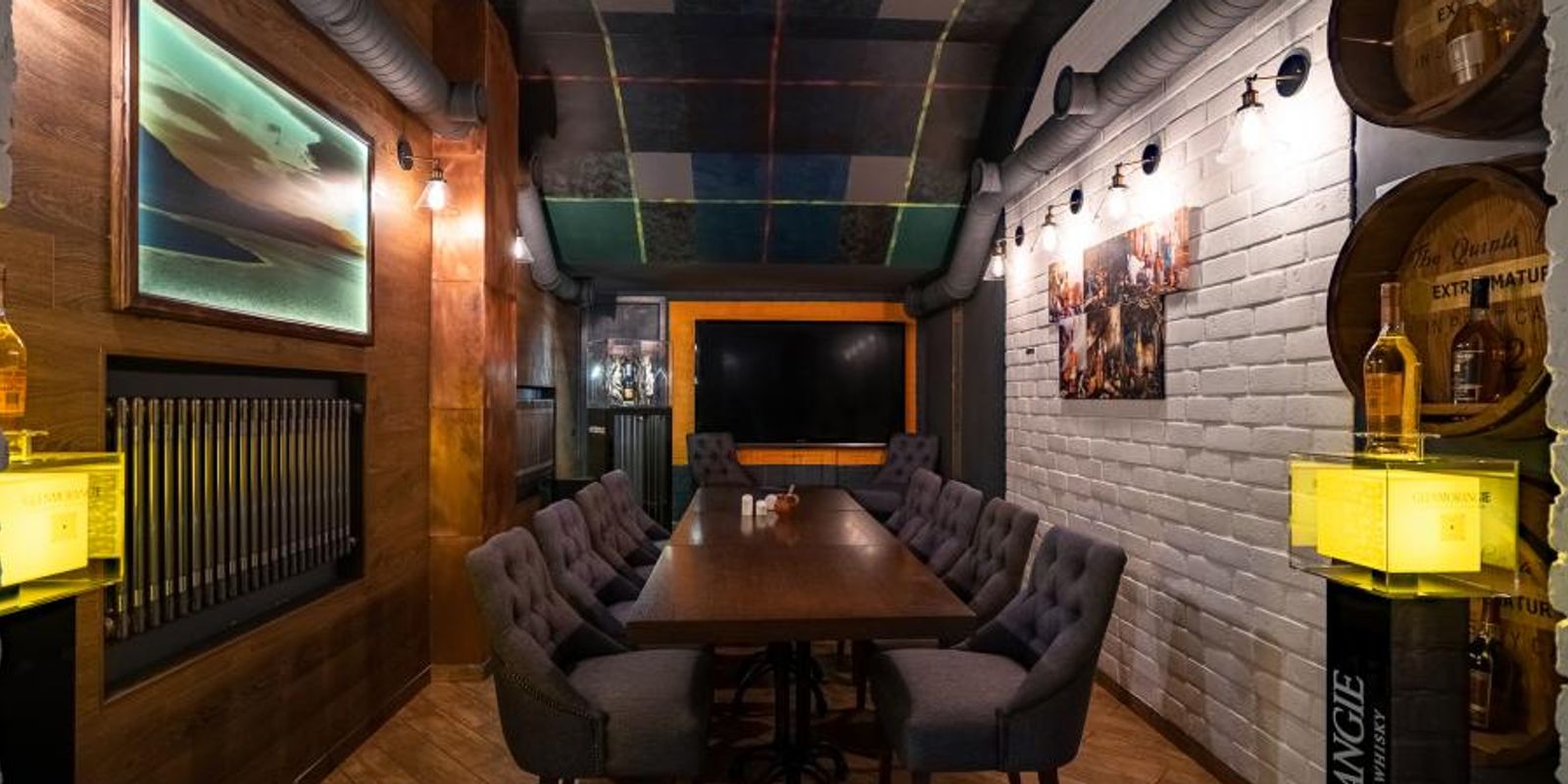 В полуподвале — пять залов, но главное происходит в барном, где наливают около 200 видов виски — по большей части это шотландские, ирландские, американские и японские образцы, однако имеются и такие редкости, как индийские и французские сингл молты.